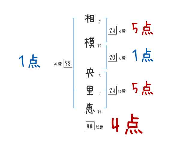 天運![]() | 相模央里恵さんの天運は24画の5つ星!家庭運が良く順調な人生。金運にも恵まれる。 家系が持つ宿命的な運勢を表します。祖先から受け継いだ苗字ですので自分の力が及びません。家柄を象徴します。 |