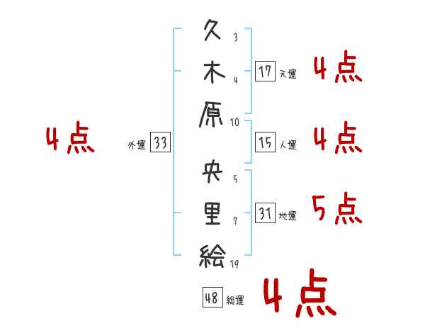 外運![]() | 久木原央里絵さんの外運は33画の4つ星!権力志向でプライドが高い。勇気があり運を切り開き成功する。 生活面を象徴する運勢です。外部から受ける影響力を表し、結婚運、家庭運や職場、環境への順応性を表します。 |