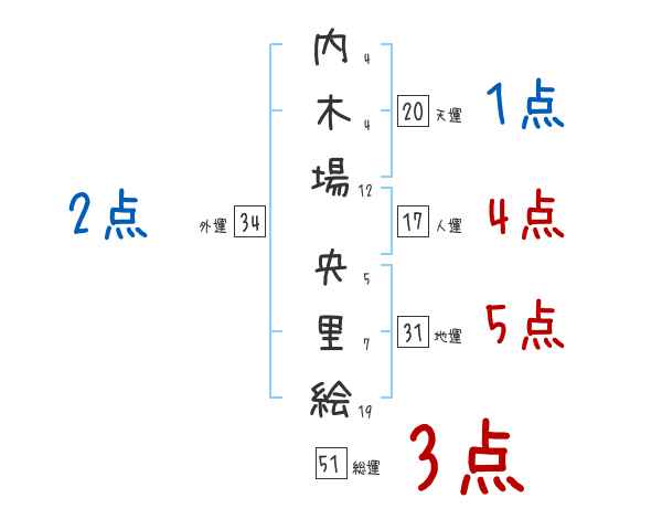 外運![]() | 内木場央里絵さんの外運は34画の2つ星!独創性に優れるが、自尊心が強く災難に注意しましょう。 生活面を象徴する運勢です。外部から受ける影響力を表し、結婚運、家庭運や職場、環境への順応性を表します。 |