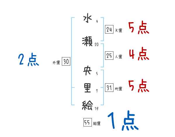 天運![]() | 水瀬央里絵さんの天運は24画の5つ星!家庭運が良く順調な人生。金運にも恵まれる。 家系が持つ宿命的な運勢を表します。祖先から受け継いだ苗字ですので自分の力が及びません。家柄を象徴します。 |