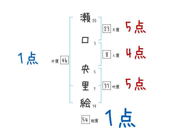 外運![]() | 瀬口央里絵さんの外運は46画の1つ星!迷走することが多く苦労するかも。目先のことにとらわれないように。 生活面を象徴する運勢です。外部から受ける影響力を表し、結婚運、家庭運や職場、環境への順応性を表します。 |