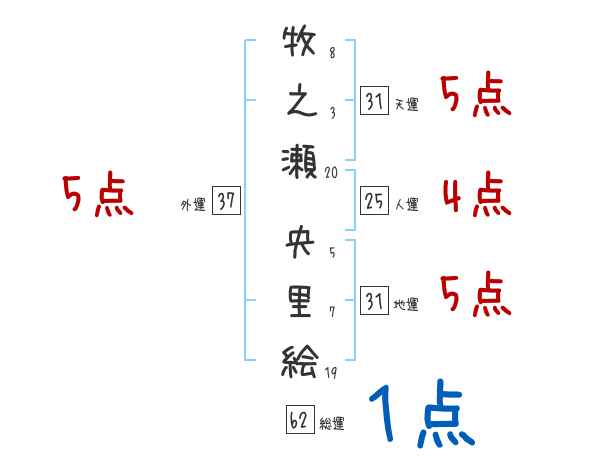 外運![]() | 牧之瀬央里絵さんの外運は37画の5つ星!努力家で順応性に優れる。現実的な考え方ができ忠実に物事をこなす。 生活面を象徴する運勢です。外部から受ける影響力を表し、結婚運、家庭運や職場、環境への順応性を表します。 |