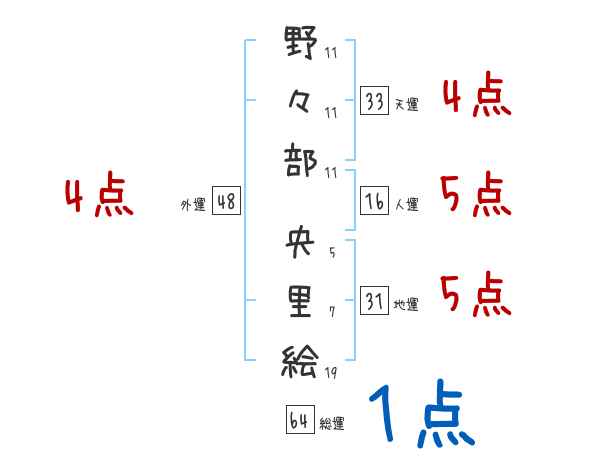 人運![]() | 野々部央里絵さんの人運は16画の5つ星!人望が厚く大きく発展する。逆転成功が見える。 性格や才能などを表す2番目に重要な運勢です。人間関係や協調性、社会的な成功に影響します。主に20歳から50歳ぐらいまでの中年期の運勢を表します。 |