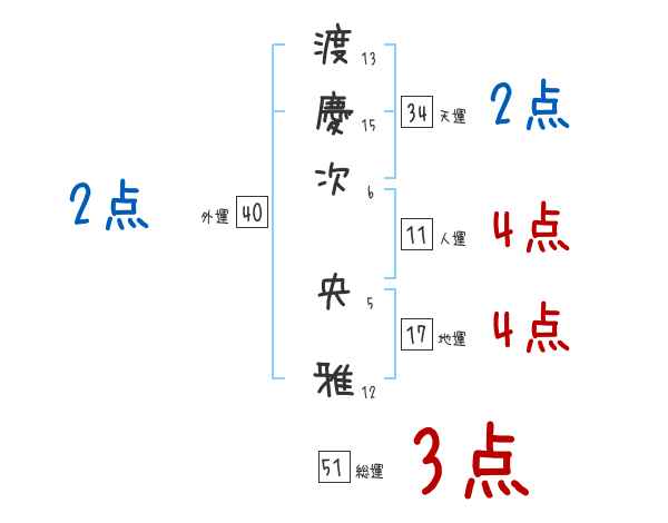 総運![]() | 渡慶次央雅さんの総運は51画の3つ星!変化が激しく、危険に注意。堅実な性格。 あなたの人生を表す1番重要な運勢です。生涯を通じて影響する総合運となり、主に50歳以降の晩年期に影響を及ぼします。 |