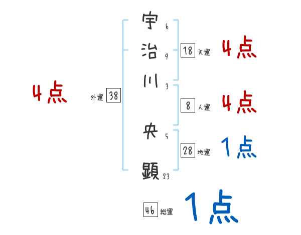 天運![]() | 宇治川央顕さんの天運は18画の4つ星!情熱的で剛気。忍耐力があり信頼される。 家系が持つ宿命的な運勢を表します。祖先から受け継いだ苗字ですので自分の力が及びません。家柄を象徴します。 |