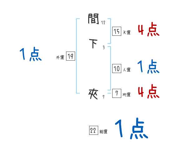 外運![]() | 間下夾さんの外運は19画の1つ星!優れた才能を持ちますが、協調性が足りないことも。周りの人と協力する事を意識しましょう。 生活面を象徴する運勢です。外部から受ける影響力を表し、結婚運、家庭運や職場、環境への順応性を表します。 |