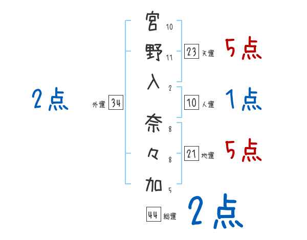 総運![]() | 宮野入奈々加さんの総運は44画の2つ星!誠実で慎重な性格。物事を考えすぎないように注意しましょう。 あなたの人生を表す1番重要な運勢です。生涯を通じて影響する総合運となり、主に50歳以降の晩年期に影響を及ぼします。 |