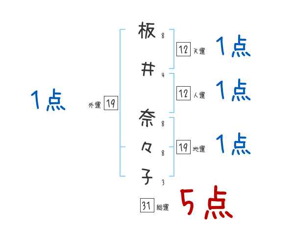 外運![]() | 板井奈々子さんの外運は19画の1つ星!優れた才能を持ちますが、協調性が足りないことも。周りの人と協力する事を意識しましょう。 生活面を象徴する運勢です。外部から受ける影響力を表し、結婚運、家庭運や職場、環境への順応性を表します。 |