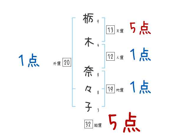 天運![]() | 栃木奈々子さんの天運は13画の5つ星!才能に恵まれ人気がある。名声を手に入れる。円満な人生。 家系が持つ宿命的な運勢を表します。祖先から受け継いだ苗字ですので自分の力が及びません。家柄を象徴します。 |