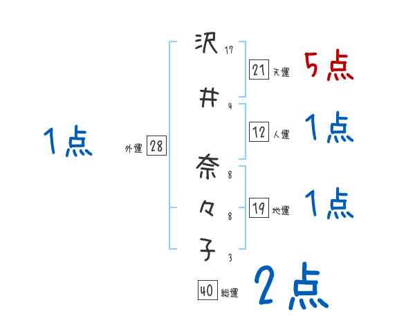 外運![]() | 沢井奈々子さんの外運は28画の1つ星!家庭環境に注意。スポーツで活躍できる能力があるかも。 生活面を象徴する運勢です。外部から受ける影響力を表し、結婚運、家庭運や職場、環境への順応性を表します。 |