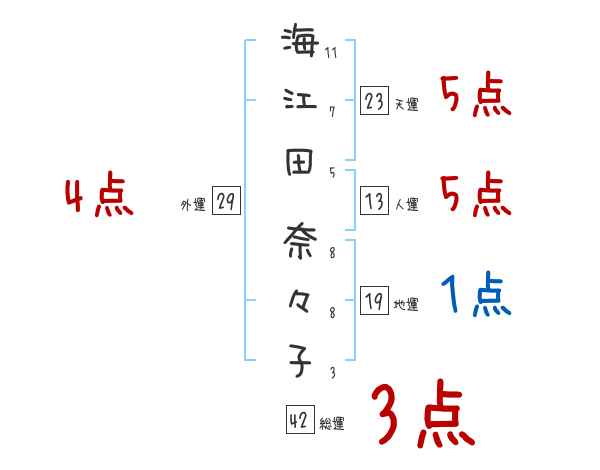 外運![]() | 海江田奈々子さんの外運は29画の4つ星!完全主義で才能がある。厳格な心の持ち主。 生活面を象徴する運勢です。外部から受ける影響力を表し、結婚運、家庭運や職場、環境への順応性を表します。 |