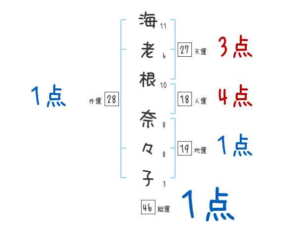 総運![]() | 海老根奈々子さんの総運は46画の1つ星!迷走することが多く苦労するかも。目先のことにとらわれないように。 あなたの人生を表す1番重要な運勢です。生涯を通じて影響する総合運となり、主に50歳以降の晩年期に影響を及ぼします。 |