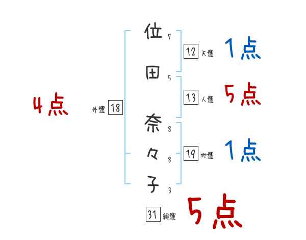 外運![]() | 位田奈々子さんの外運は18画の4つ星!情熱的で剛気。忍耐力があり信頼される。 生活面を象徴する運勢です。外部から受ける影響力を表し、結婚運、家庭運や職場、環境への順応性を表します。 |