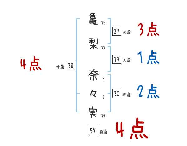 総運![]() | 亀梨奈々実さんの総運は57画の4つ星!向上心があり人望がある。地位を得る。 あなたの人生を表す1番重要な運勢です。生涯を通じて影響する総合運となり、主に50歳以降の晩年期に影響を及ぼします。 |
