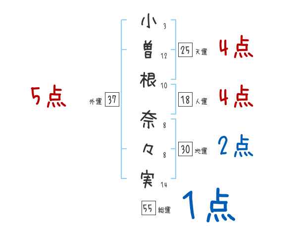 総運![]() | 小曽根奈々実さんの総運は55画の1つ星!欲張りな性格で軽率な行動に注意しましょう。病気に気をつけて。 あなたの人生を表す1番重要な運勢です。生涯を通じて影響する総合運となり、主に50歳以降の晩年期に影響を及ぼします。 |