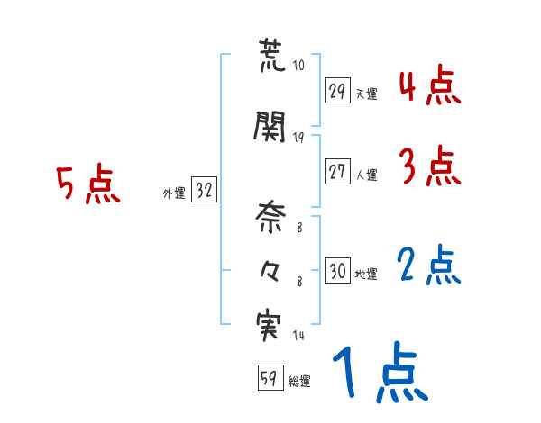 外運![]() | 荒関奈々実さんの外運は32画の5つ星!柔軟性があり成功する。チャンスが多く金運が良い。 生活面を象徴する運勢です。外部から受ける影響力を表し、結婚運、家庭運や職場、環境への順応性を表します。 |