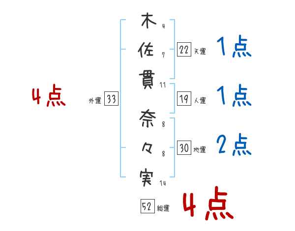 外運![]() | 木佐貫奈々実さんの外運は33画の4つ星!権力志向でプライドが高い。勇気があり運を切り開き成功する。 生活面を象徴する運勢です。外部から受ける影響力を表し、結婚運、家庭運や職場、環境への順応性を表します。 |