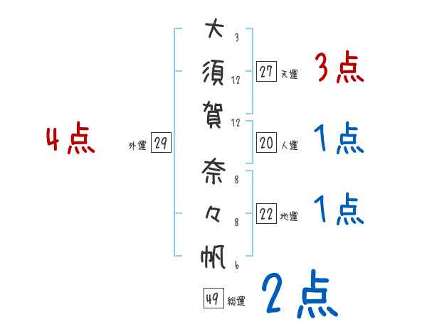 天運![]() | 大須賀奈々帆さんの天運は27画の3つ星!頭脳明晰だが強情で摩擦が多い傾向。孤立に注意。 家系が持つ宿命的な運勢を表します。祖先から受け継いだ苗字ですので自分の力が及びません。家柄を象徴します。 |