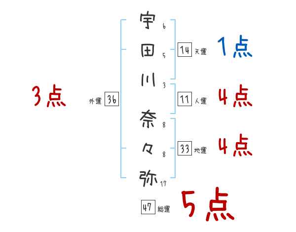 総運![]() | 宇田川奈々弥さんの総運は47画の5つ星!実力が開花し発展する円満な人生。財に恵まれる。 あなたの人生を表す1番重要な運勢です。生涯を通じて影響する総合運となり、主に50歳以降の晩年期に影響を及ぼします。 |