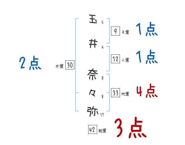 外運![]() | 玉井奈々弥さんの外運は30画の2つ星!浮き沈みの激しさに注意しましょう。 生活面を象徴する運勢です。外部から受ける影響力を表し、結婚運、家庭運や職場、環境への順応性を表します。 |