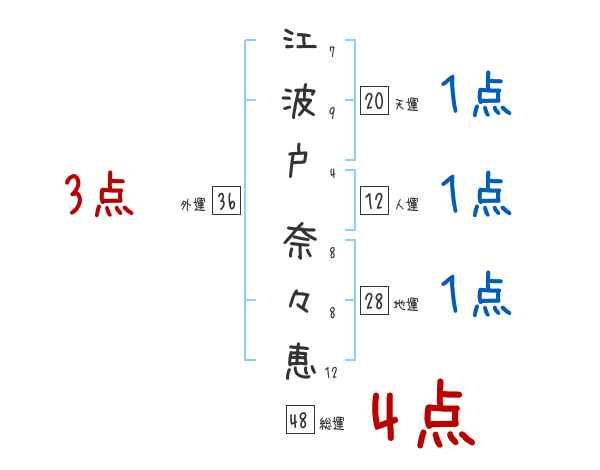 外運![]() | 江波戸奈々恵さんの外運は36画の3つ星!先見性が豊かです。多少神経質で苦労することも。 生活面を象徴する運勢です。外部から受ける影響力を表し、結婚運、家庭運や職場、環境への順応性を表します。 |