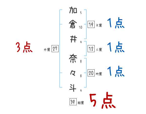 天運![]() | 加倉井奈々斗さんの天運は19画の1つ星!優れた才能を持ちますが、協調性が足りないことも。周りの人と協力する事を意識しましょう。 家系が持つ宿命的な運勢を表します。祖先から受け継いだ苗字ですので自分の力が及びません。家柄を象徴します。 |