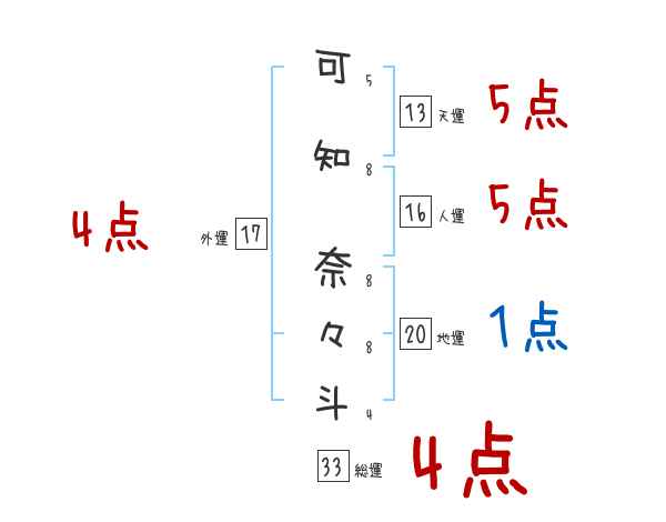 外運![]() | 可知奈々斗さんの外運は17画の4つ星!積極的な行動力。地位を気づき財産を手に入れる。純粋な心と直感力。 生活面を象徴する運勢です。外部から受ける影響力を表し、結婚運、家庭運や職場、環境への順応性を表します。 |