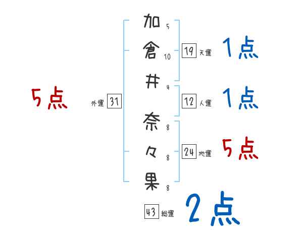 総運![]() | 加倉井奈々果さんの総運は43画の2つ星!頑固な性格で独立心が強いかも。やや非現実的で浪費に注意しましょう。 あなたの人生を表す1番重要な運勢です。生涯を通じて影響する総合運となり、主に50歳以降の晩年期に影響を及ぼします。 |