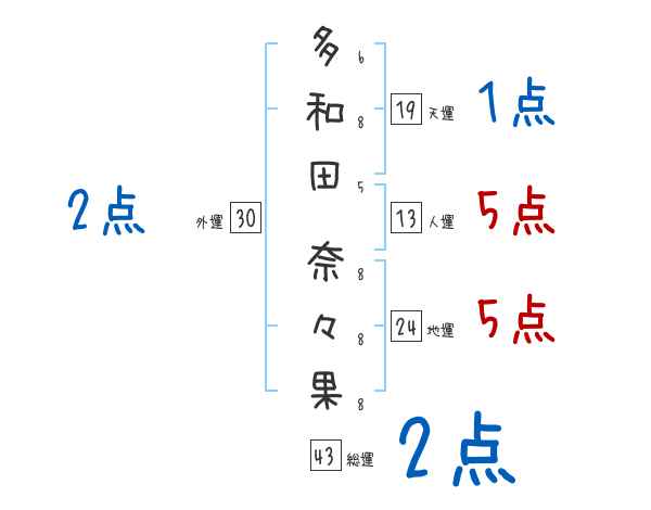 総運![]() | 多和田奈々果さんの総運は43画の2つ星!頑固な性格で独立心が強いかも。やや非現実的で浪費に注意しましょう。 あなたの人生を表す1番重要な運勢です。生涯を通じて影響する総合運となり、主に50歳以降の晩年期に影響を及ぼします。 |