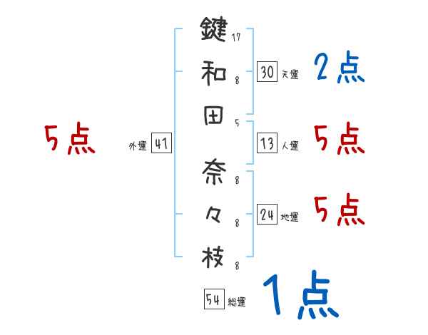 天運![]() | 鍵和田奈々枝さんの天運は30画の2つ星!浮き沈みの激しさに注意しましょう。 家系が持つ宿命的な運勢を表します。祖先から受け継いだ苗字ですので自分の力が及びません。家柄を象徴します。 |