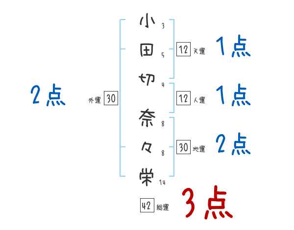 外運![]() | 小田切奈々栄さんの外運は30画の2つ星!浮き沈みの激しさに注意しましょう。 生活面を象徴する運勢です。外部から受ける影響力を表し、結婚運、家庭運や職場、環境への順応性を表します。 |