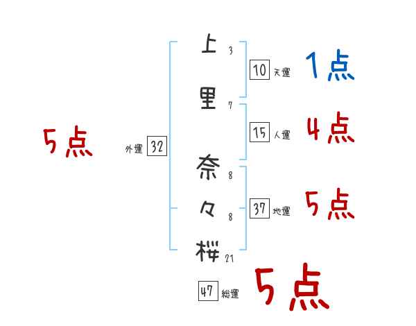 外運![]() | 上里奈々桜さんの外運は32画の5つ星!柔軟性があり成功する。チャンスが多く金運が良い。 生活面を象徴する運勢です。外部から受ける影響力を表し、結婚運、家庭運や職場、環境への順応性を表します。 |