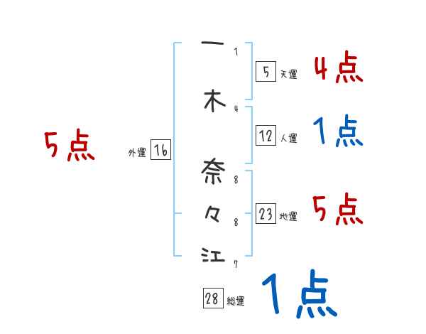 天運![]() | 一木奈々江さんの天運は5画の4つ星!健康で安泰。協調性に優れ、財産に恵まれる。 家系が持つ宿命的な運勢を表します。祖先から受け継いだ苗字ですので自分の力が及びません。家柄を象徴します。 |