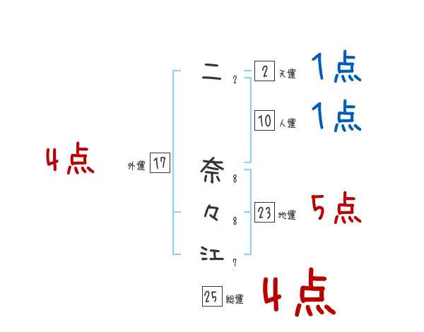 外運![]() | 二奈々江さんの外運は17画の4つ星!積極的な行動力。地位を気づき財産を手に入れる。純粋な心と直感力。 生活面を象徴する運勢です。外部から受ける影響力を表し、結婚運、家庭運や職場、環境への順応性を表します。 |
