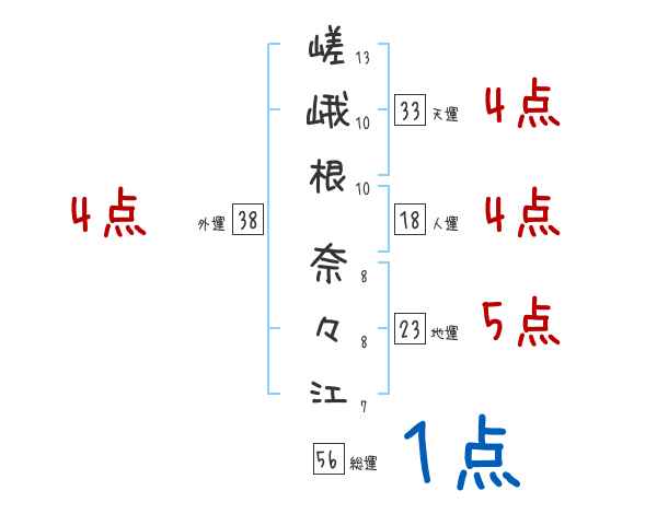 天運![]() | 嵯峨根奈々江さんの天運は33画の4つ星!権力志向でプライドが高い。勇気があり運を切り開き成功する。 家系が持つ宿命的な運勢を表します。祖先から受け継いだ苗字ですので自分の力が及びません。家柄を象徴します。 |