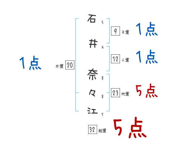 総運![]() | 石井奈々江さんの総運は32画の5つ星!柔軟性があり成功する。チャンスが多く金運が良い。 あなたの人生を表す1番重要な運勢です。生涯を通じて影響する総合運となり、主に50歳以降の晩年期に影響を及ぼします。 |