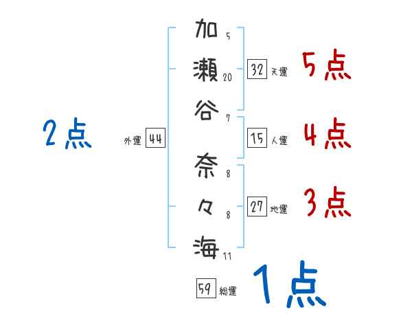 天運![]() | 加瀬谷奈々海さんの天運は32画の5つ星!柔軟性があり成功する。チャンスが多く金運が良い。 家系が持つ宿命的な運勢を表します。祖先から受け継いだ苗字ですので自分の力が及びません。家柄を象徴します。 |