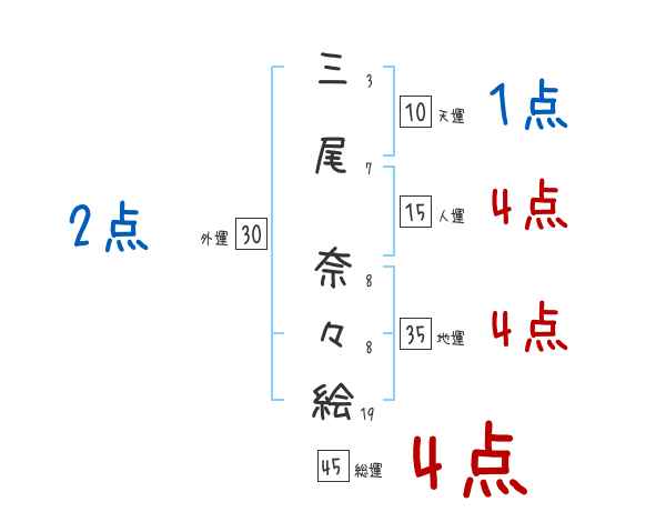 | 地運  | 三尾奈々絵さんの地運は35画の4つ星!温厚な性格で感受性が高い。穏和な性格で人望が厚い。個性を表す基礎的な運勢です。性格形成や対人関係、行動力など家庭環境に影響されます。主に誕生してから20歳くらいまでの若年期の運勢を表します。 |