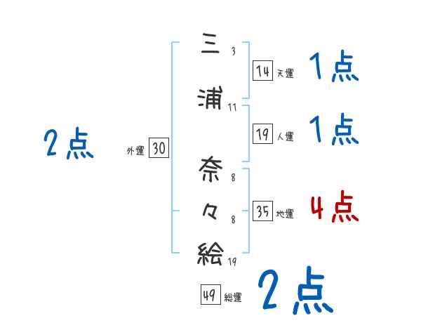 総運![]() | 三浦奈々絵さんの総運は49画の2つ星!不安定な性格で明暗がある人生。周りの人には支援されやすい。 あなたの人生を表す1番重要な運勢です。生涯を通じて影響する総合運となり、主に50歳以降の晩年期に影響を及ぼします。 |
