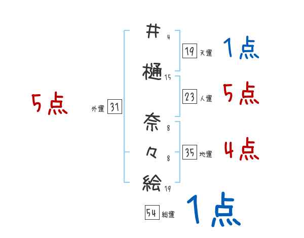 人運![]() | 井樋奈々絵さんの人運は23画の5つ星!想像力に優れ活力がある。一代で成功し名誉を手に入れる。 性格や才能などを表す2番目に重要な運勢です。人間関係や協調性、社会的な成功に影響します。主に20歳から50歳ぐらいまでの中年期の運勢を表します。 |