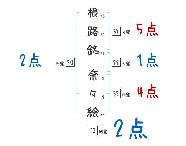 外運![]() | 根路銘奈々絵さんの外運は50画の2つ星!浮き沈みが激しく不安定。しりすぼみに衰退しやすいので注意しましょう。 生活面を象徴する運勢です。外部から受ける影響力を表し、結婚運、家庭運や職場、環境への順応性を表します。 |