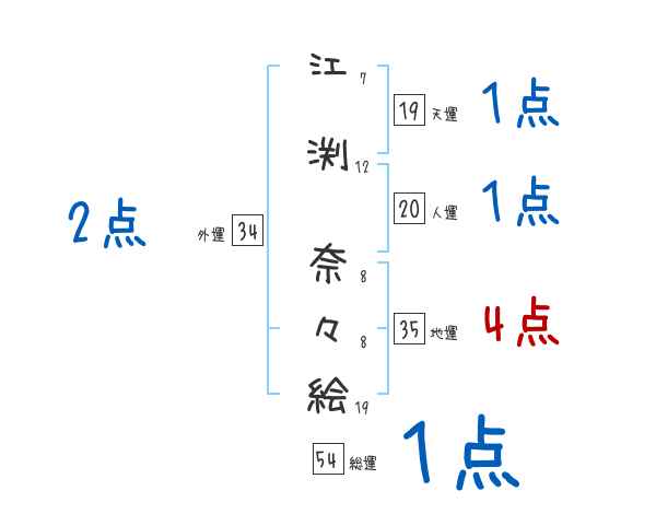 総運![]() | 江渕奈々絵さんの総運は54画の1つ星!トラブルが多いかも。周りをよく見て協調して過ごしましょう。 あなたの人生を表す1番重要な運勢です。生涯を通じて影響する総合運となり、主に50歳以降の晩年期に影響を及ぼします。 |