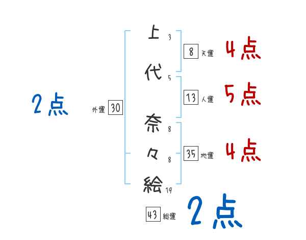 外運![]() | 上代奈々絵さんの外運は30画の2つ星!浮き沈みの激しさに注意しましょう。 生活面を象徴する運勢です。外部から受ける影響力を表し、結婚運、家庭運や職場、環境への順応性を表します。 |