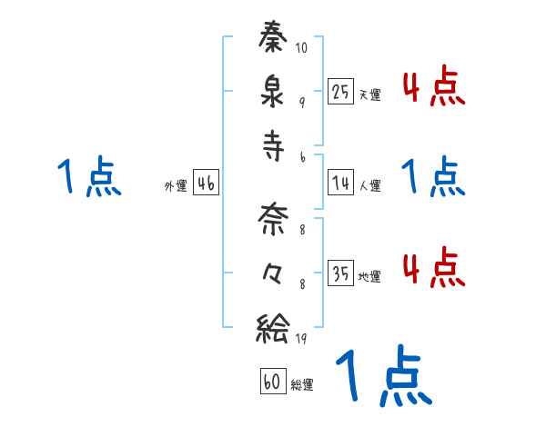 人運![]() | 秦泉寺奈々絵さんの人運は14画の1つ星!人に対して優しいがストレスを溜め込みがち。人間関係のトラブルを避けるよう気をつけましょう。 性格や才能などを表す2番目に重要な運勢です。人間関係や協調性、社会的な成功に影響します。主に20歳から50歳ぐらいまでの中年期の運勢を表します。 |