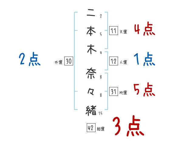 天運![]() | 二本木奈々緒さんの天運は11画の4つ星!着実に富や地位を得る幸運な人生。 家系が持つ宿命的な運勢を表します。祖先から受け継いだ苗字ですので自分の力が及びません。家柄を象徴します。 |