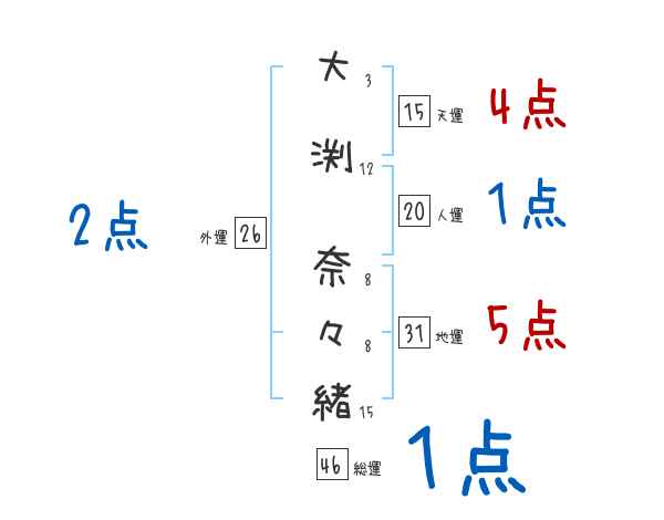 総運![]() | 大渕奈々緒さんの総運は46画の1つ星!迷走することが多く苦労するかも。目先のことにとらわれないように。 あなたの人生を表す1番重要な運勢です。生涯を通じて影響する総合運となり、主に50歳以降の晩年期に影響を及ぼします。 |