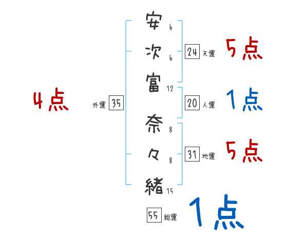 天運![]() | 安次富奈々緒さんの天運は24画の5つ星!家庭運が良く順調な人生。金運にも恵まれる。 家系が持つ宿命的な運勢を表します。祖先から受け継いだ苗字ですので自分の力が及びません。家柄を象徴します。 |