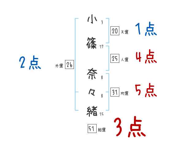 外運![]() | 小篠奈々緒さんの外運は26画の2つ星!波瀾万丈かも。信頼できる人を大事にしましょう。 生活面を象徴する運勢です。外部から受ける影響力を表し、結婚運、家庭運や職場、環境への順応性を表します。 |