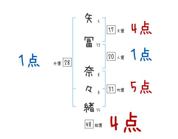 天運![]() | 矢冨奈々緒さんの天運は17画の4つ星!積極的な行動力。地位を気づき財産を手に入れる。純粋な心と直感力。 家系が持つ宿命的な運勢を表します。祖先から受け継いだ苗字ですので自分の力が及びません。家柄を象徴します。 |