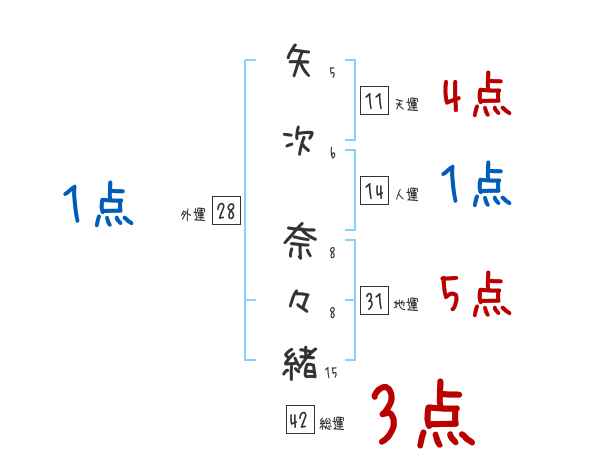 天運![]() | 矢次奈々緒さんの天運は11画の4つ星!着実に富や地位を得る幸運な人生。 家系が持つ宿命的な運勢を表します。祖先から受け継いだ苗字ですので自分の力が及びません。家柄を象徴します。 |